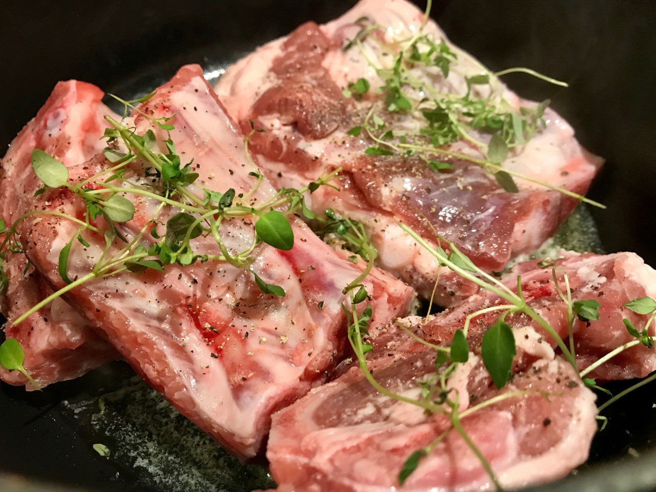 - Svits ribben i smør på begge sider over flere omgange i en stor gryde. Krydr benene med frisk timian og peber. Efter bruning lægges benene fra på en tallerken. Jeg brugte to gryder. I min støbejernsgryde svitsede jeg benene, og efterfølgende kom det hele i min store suppegryde.