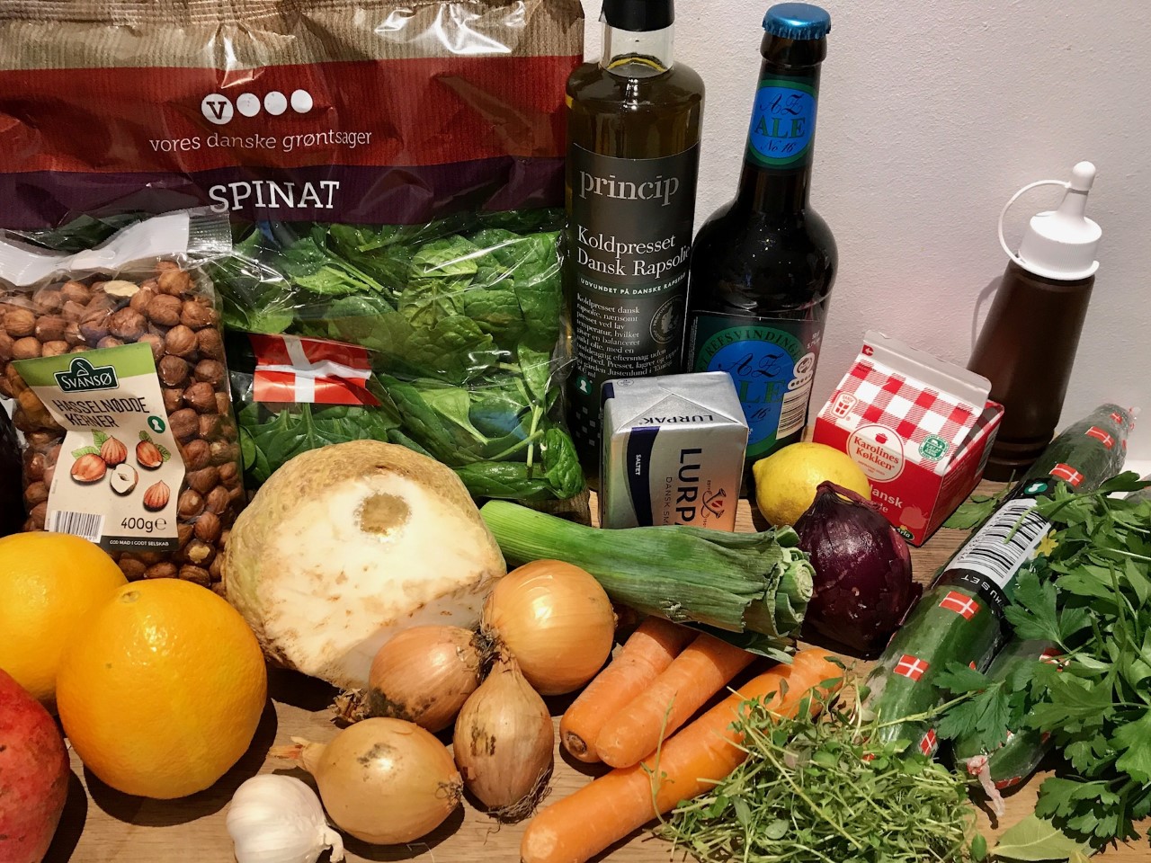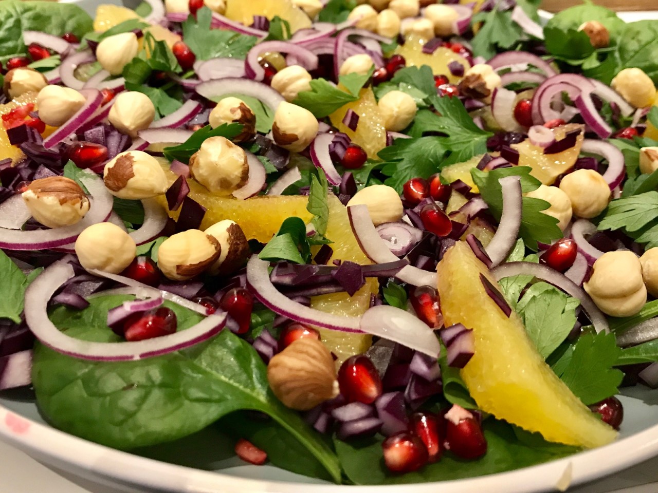 - Salat : En ½ pose friske spinatblade, lidt fintsnittet rødkål, 2 appelsiner skåret i tynde appelsinfileter, halvdelen af et lille rødløg skåret i tynde skiver,1 håndfuld ristede og afskallede hasselnødder, 1 håndfuld granatæblekerner, lidt grovhakket bredbladet persille og dressing af honning og frisk citronsaft.
